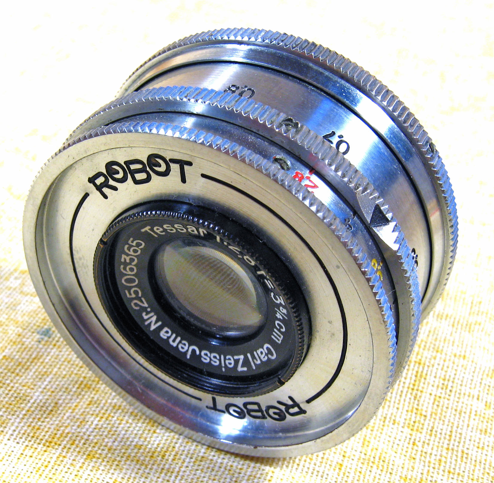 Objectif de construction métallique n° 2506365, focale 3 3/4 ouverture 2,8, diaphragme à iris, mise au point sur hélicoidale, monture à vis diam. 26 m/mDiamètre 44,2 m/m , hauteur 32 m/m