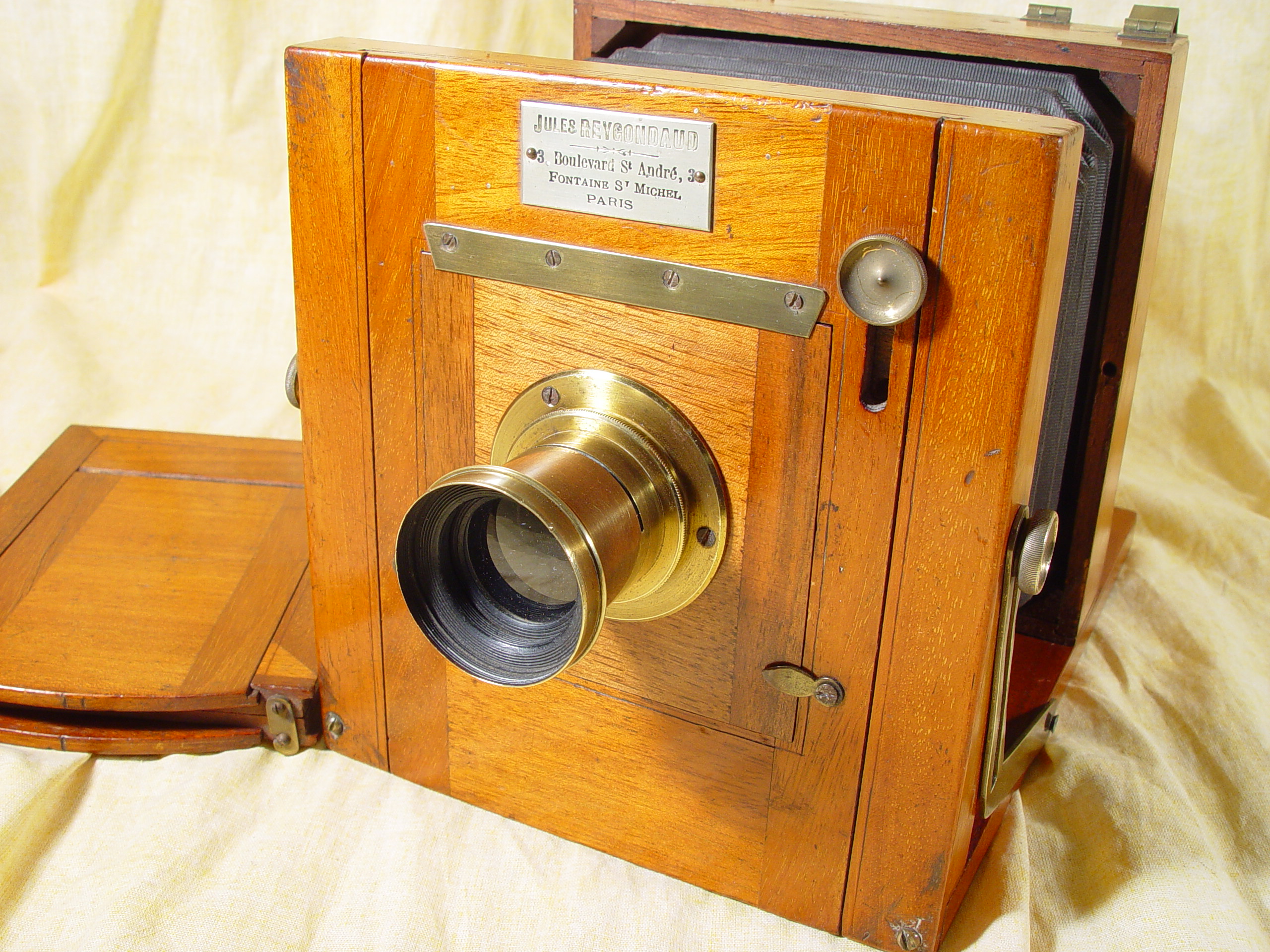 Chambre carrée format 9X12 , construction en acajou blond, platine arrière amovible pour cadrage V ou H, déplaçement par manivelle, soufflet carré noir tramage toile, chassis double