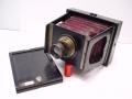 chambre a joues construite en bois d'ebene, format 9X12 sur plaques de verre,soufflet cuir rouge,depoli sur cadre, chassis, ferrures nickelees