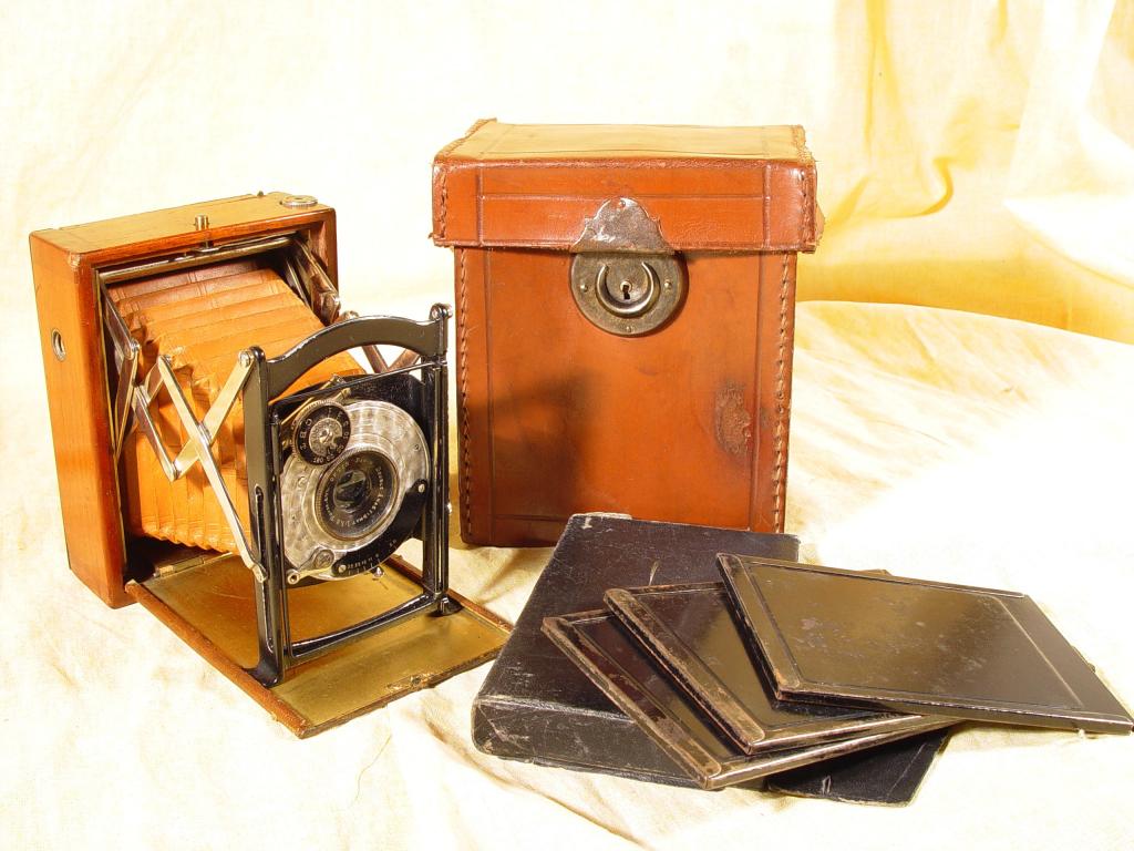 Appareil en bois de teck format 6,5X9, dimensions fermé 115X90X30, mise au point en même temps que l'ouvertire, abattant métallique gainé , ciseaux en laiton nickelé, soufflet cuir fauve