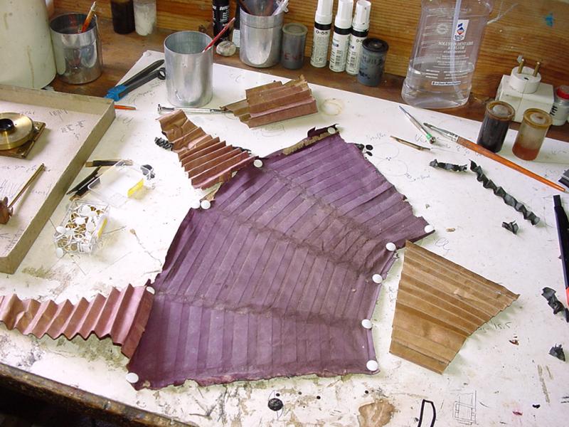ici une etape du reconditionnement du soufflet decollage total nettoyage recollage des gabarits de plissage mise en plis sechage partiel sou presse puis application d'une creme teintante pour cuir