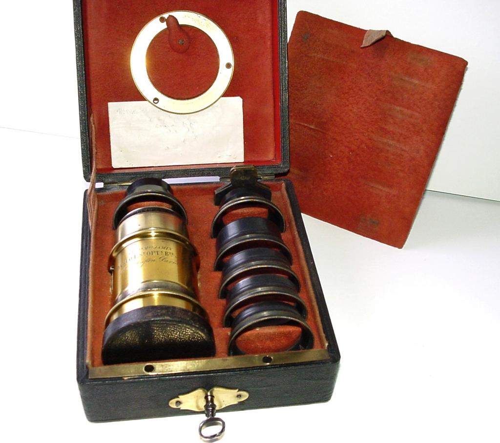 Coffret d'objectif DARLOT A , ancienne maison JAMIN, pour portrait et paysage avec possibilité grand angle bague de vissage insérée dans le couvercle, jeux de vannes, 8 compléments optiques