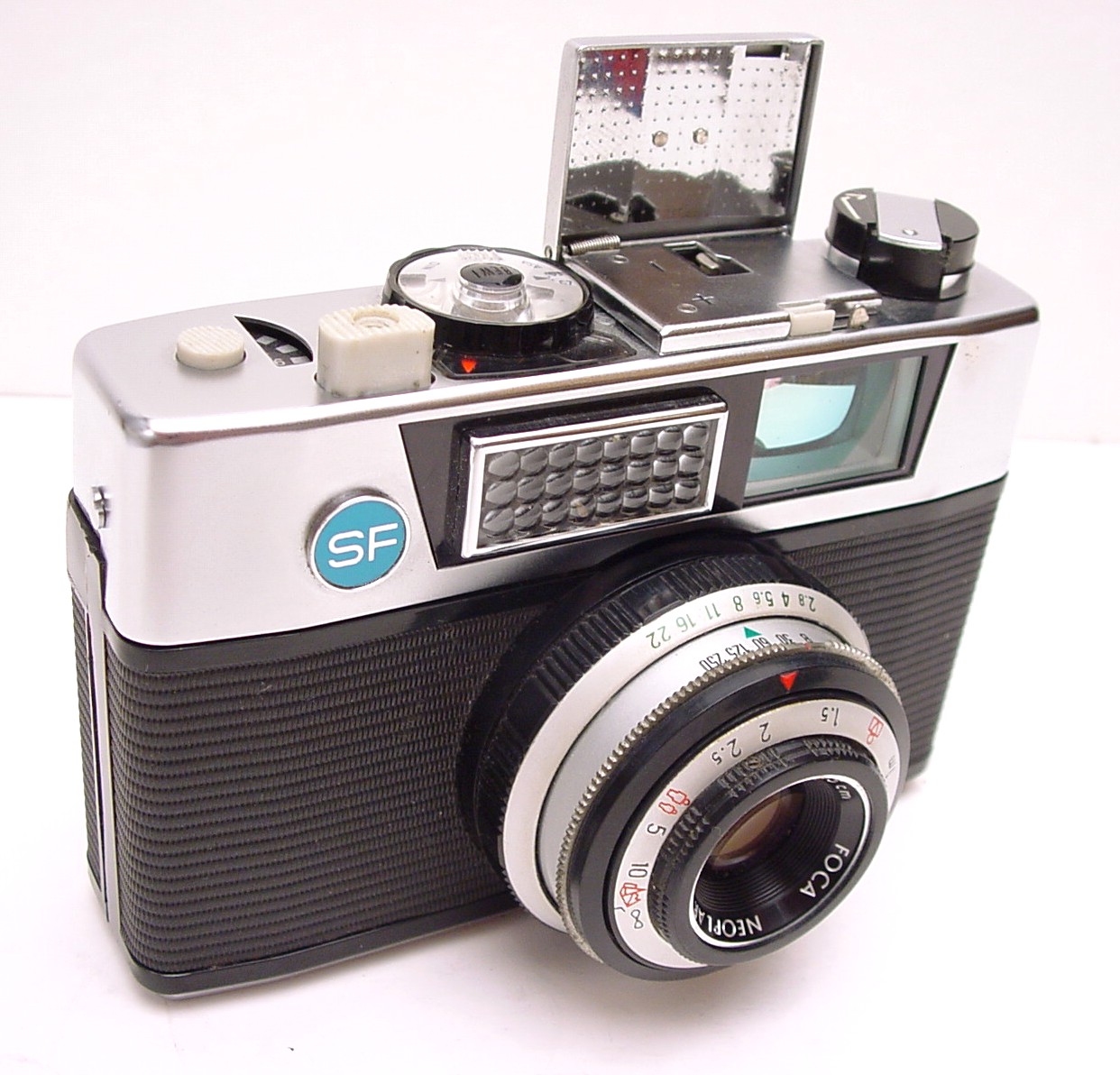 Modéle de 3ème série , le F désignant Flash, construction en matière plastique, revètement simili noir, objectif FOCA NEOPLAR 2,8/45, réglage des distances par symboles, vitesses 30,60,125,250
