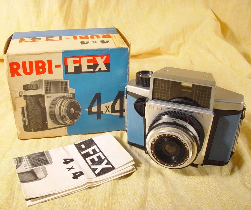 Appareil pour image 4X4 sur film 127, objectif ménisque Ultrar n° 480231, obturateur à trois vitesses 25,50,100, deux valeurs de diaph soleil fort et faible, gainage plastique bleu, capot gris