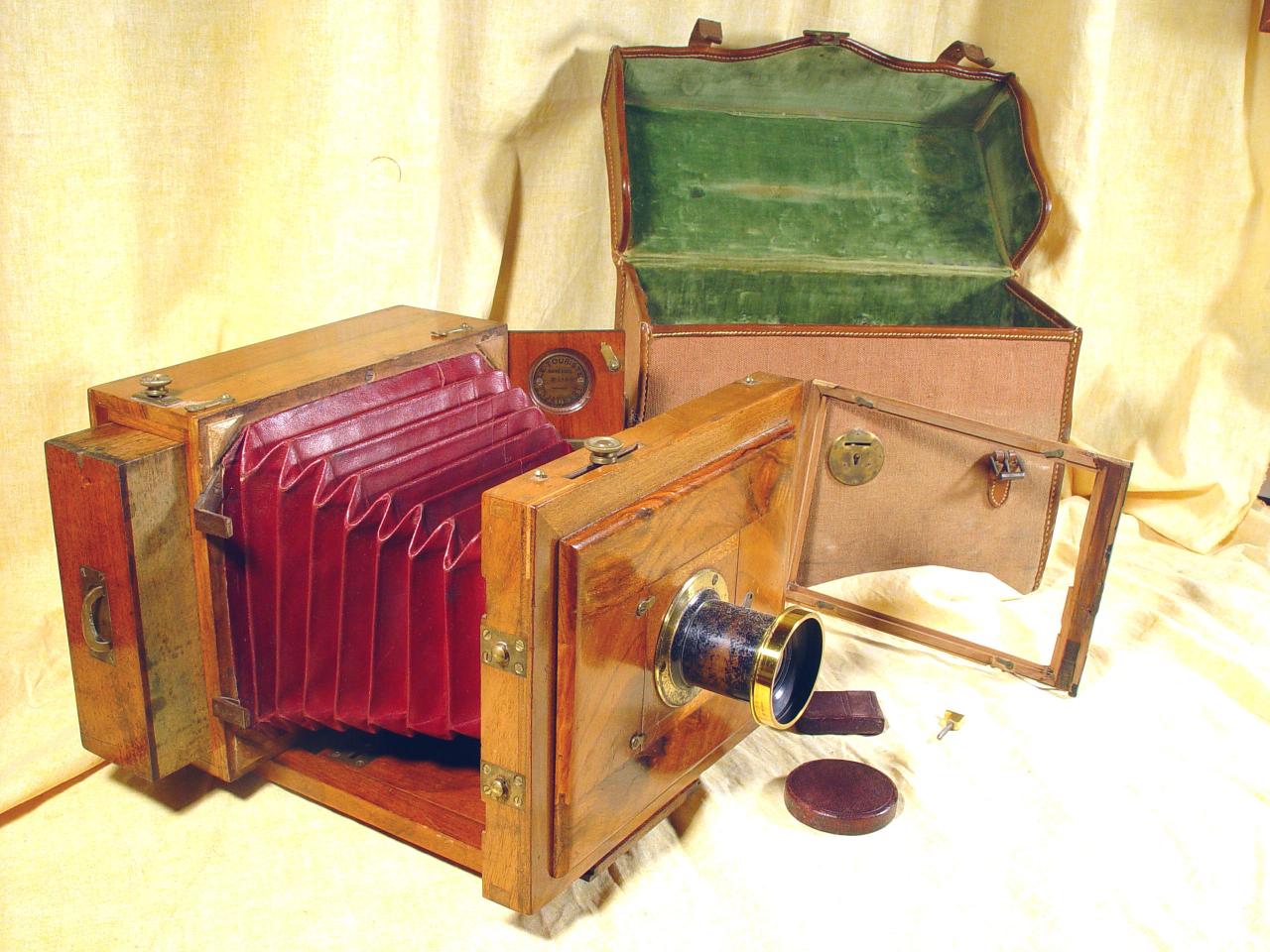 Chambre format 13X18 construction en noyer, cet appareil ayant la particularité de posséder un dos à escamotage contenant huit chassis porte plaques et un cadre dépoli, soufflet cuir rouge, objectif